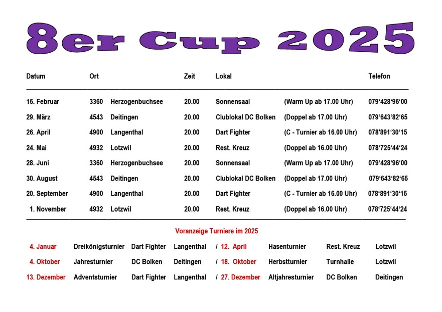 Wir haben im laufe des Jahres noch andere Aktivitäten wie z.B. die Fasnacht an denen wir aktiv teilnehmen. Wir stellen unser Lokal auch für Vereine und Firmen zur Verfügung, die gerne mehr über unsere Sportart wissen möchten und/oder ein Dart-Plauschturnier für Ihren Verein/Firma organisieren möchten.
